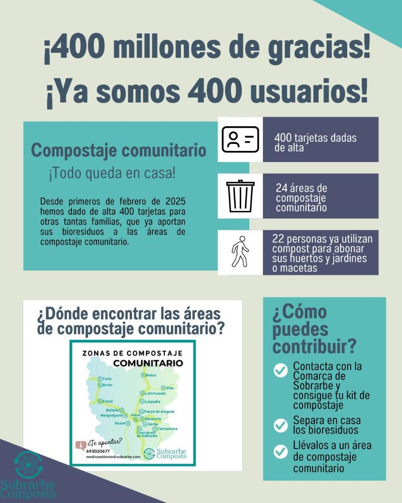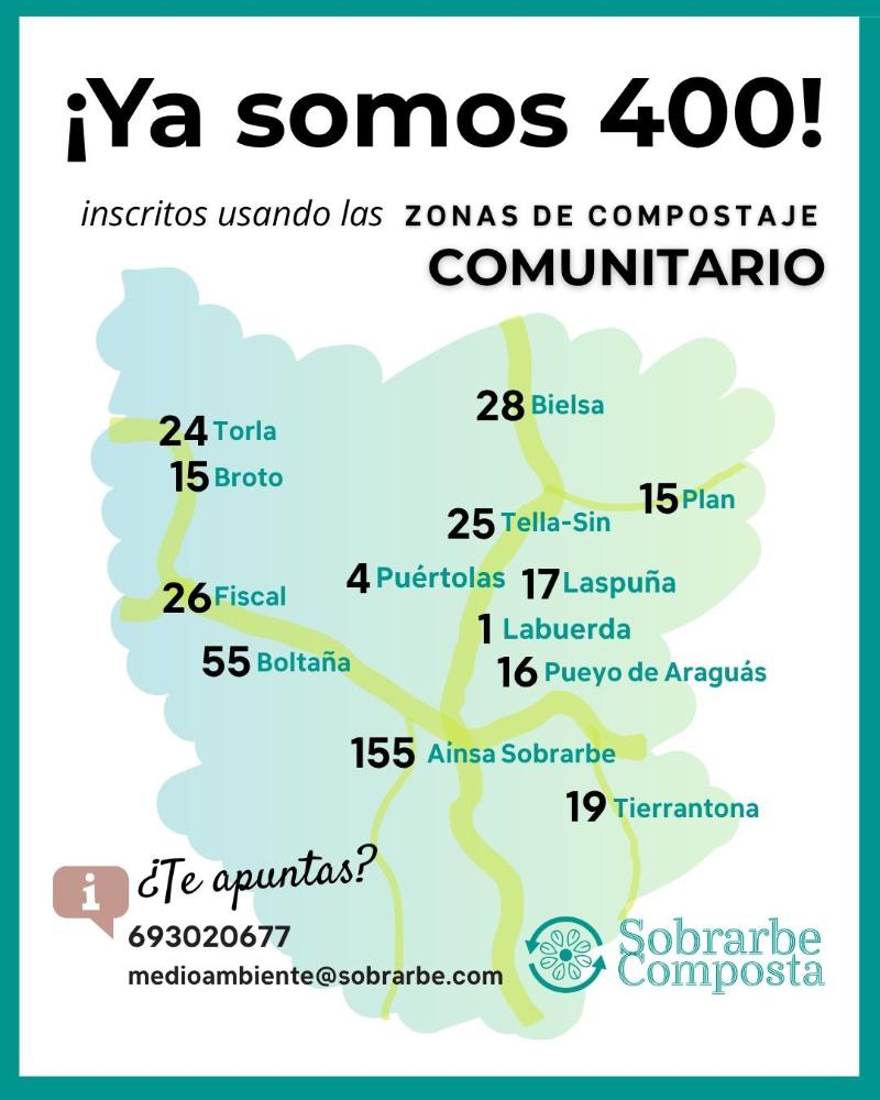 El servicio de compostaje comunitario impulsado por la Comarca de Sobrarbe ha alcanzado un nuevo hito: 400 personas inscritas participan ya activamente en este sistema de gestión de residuos orgánicos. Se trata de un ejemplo claro de compromiso ciudadano con el medio ambiente y la economía circular.