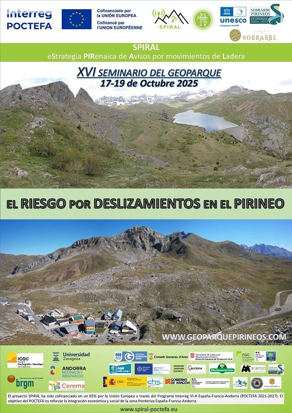"El riesgo por deslizamientos en el Pirineo". La nueva edición del Seminario del Geoparque tendrá lugar los días 17,18 y 19 de octubre en Boltaña. Sede de la Comarca de Sobrarbe. En esta ocasión forma parte de una de las acciones que se desarrollan desde el proyecto SPIRAL (eStrategia PIRenaica de Avisos por movimientos de Ladera,) en el que el Geoparque colabora como asociado del proyecto de la mano de la Universidad de Zaragoza.