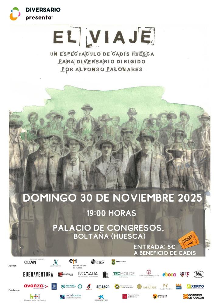 Este domingo 30 de noviembre, a las 19 horas, en el Palacio de congresos de Boltaña, la obra "El viaje". Dirigida por Alfonso Palomares. Toda la recaudación en beneficio de Cadis Huesca